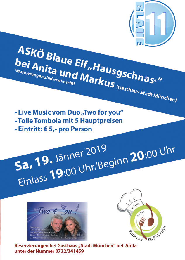ASKÖ Blaue Elf “Hausgschnas” bei Anita und Markus 10. Januar 2019 admin Mehr Bilder zu diesem Beitrag Wir möchten Euch herzlich zu unserem “ASKÖ Blaue Elf Hausgschnas“ am Samstag, 19.01.2018 bei Anita und Markus (Gasthaus Stadt München) einladen.